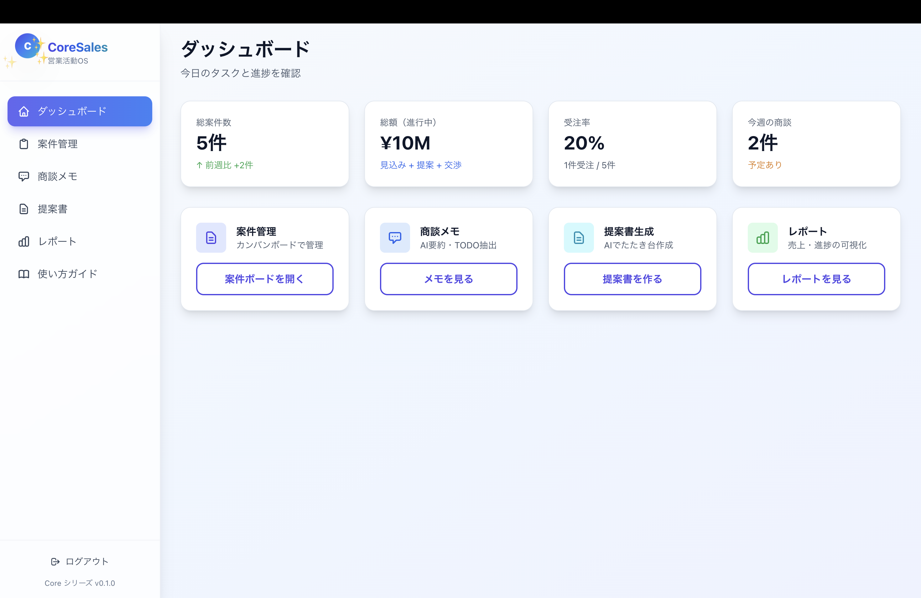 1日300件の電話営業にも耐えうる大量案件処理に対応した営業OS。カンバン・テーブルビューで案件を管理し、商談メモからAIが要約・TODO・提案書を自動生成。KPIダッシュボードで受注率・売上推移を可視化。