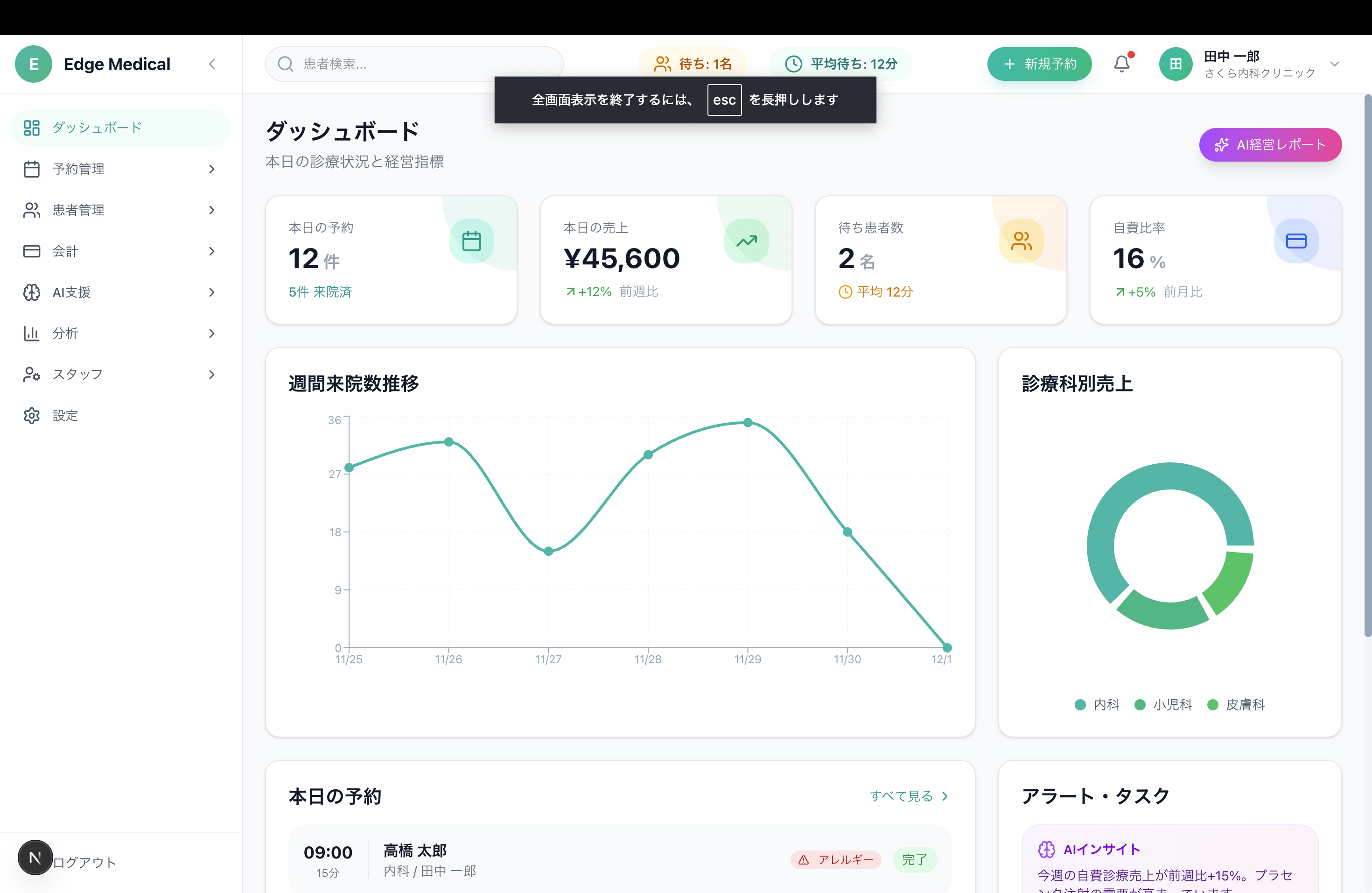 予約・問診・受付・カルテ・会計・レセプトまでを統合し、AIが問診要約やカルテ作成、経営レポートを自動化するクリニック向け次世代診療支援OS。